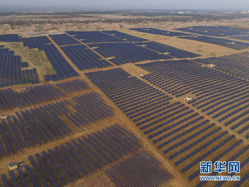 亿利集团在沙漠修建的光伏太阳能发电站,太阳能板下面种植的是甘草。“治沙+发电+种植+养殖+扶贫”的模式在这里展开。新华网发(乔治·斯坦梅茨航拍于2016年9月)