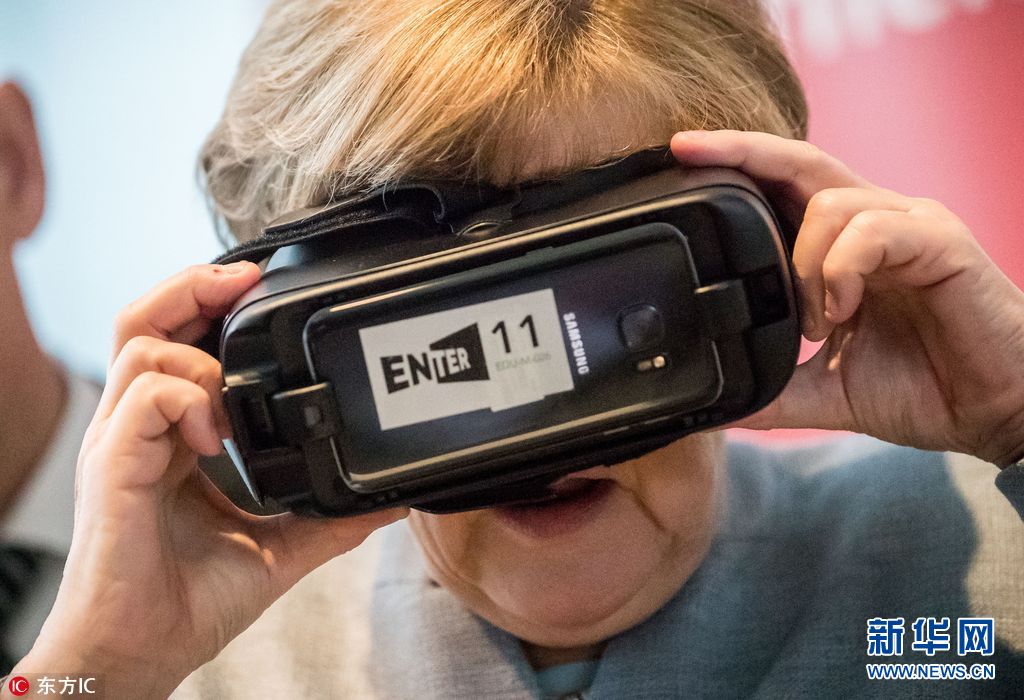 当地时间2016年4月26日,德国柏林,德国总理府举办女生日活动,默克尔出席试戴一个VR眼镜。(图片来源: 东方IC)