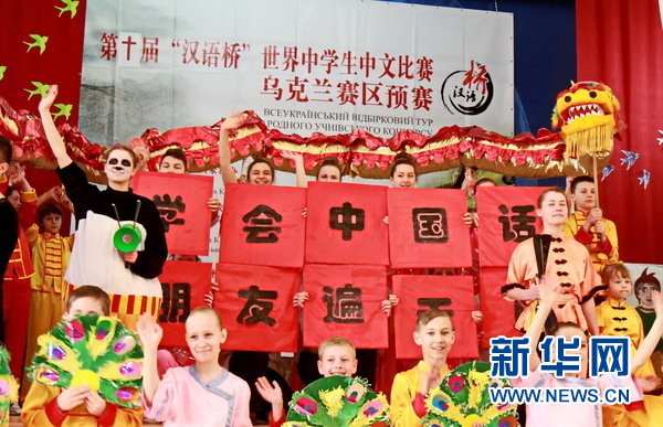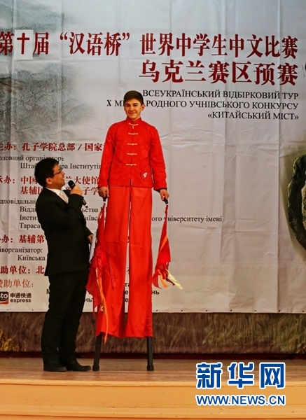 第十届“汉语桥”世界中学生中文比赛乌克兰赛区预赛开始前的文艺表演。新华网发(谢尔盖摄)