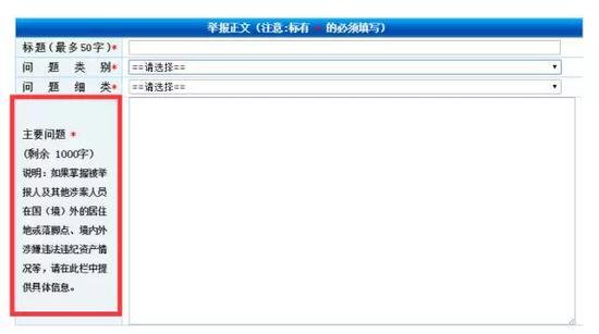填写举报内容前,请认真考虑您要反映的问题是否属于反腐败国际追逃追赃的范围。请注意,如果是其他类别的问题如党风政风举报请前往http://jfts.mos.gov.cn/;信访举报请点击http://www.12388.gov.cn/。