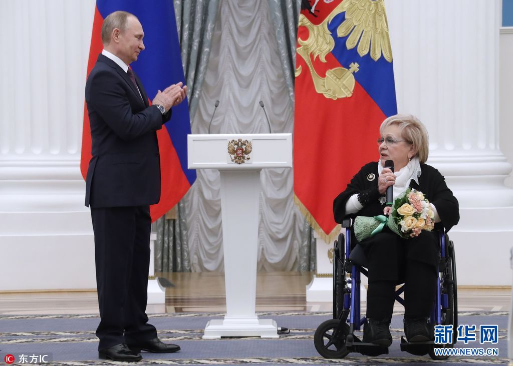 当地时间2017年4月28日,俄罗斯莫斯科,俄罗斯总统普京为“俄罗斯联邦劳动英雄”奖章获得者颁奖。(图片来源: 东方IC)