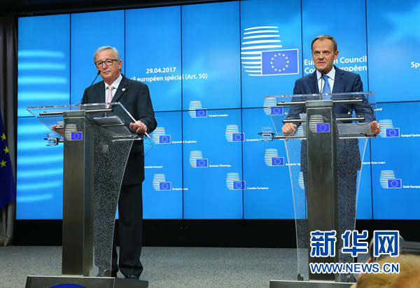 4月29日,在比利时首都布鲁塞尔的欧盟总部,欧盟委员会主席容克(左)和欧洲理事会主席图斯克在会议闭幕后出席新闻发布会。新华社记者龚兵 摄