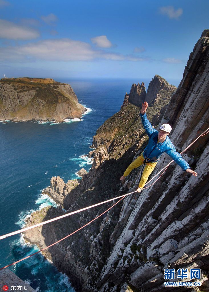 2017年5月2日报道(具体拍摄时间不详),一名大胆的刺激运动爱好者在400米高的悬崖走钢丝,他的脚下是不停冲刷岩石的海水。这组惊险的照片记录了Luka Irmler在塔斯马尼亚两处陡峭的海崖之间小心翼翼地走钢丝。(图片来源: 东方IC)