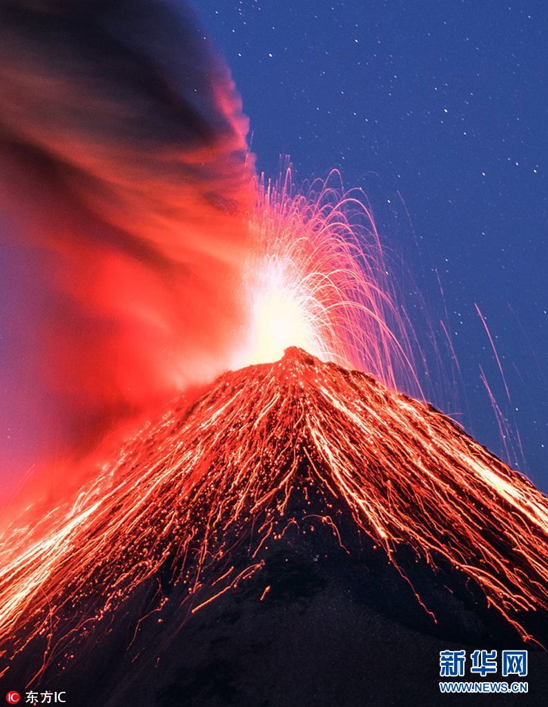 2017年5月2日报道(具体拍摄时间不详),一位勇敢的摄影师成功拍摄到危地马拉火山喷发的震撼画面,其中一张照片中,他甚至捕获到银河与火山惊喜同框的画面。为了拍摄到危地马拉富果火山喷发中的完美画面,摄影师艾伯特(Albert Dros)不惜露宿野外。在他拍摄到的画面中,火红的岩浆从火山顶部喷涌而出,而与此同时美丽的银河在夜空中闪闪发光,与火山相映成辉。(图片来源:东方IC)