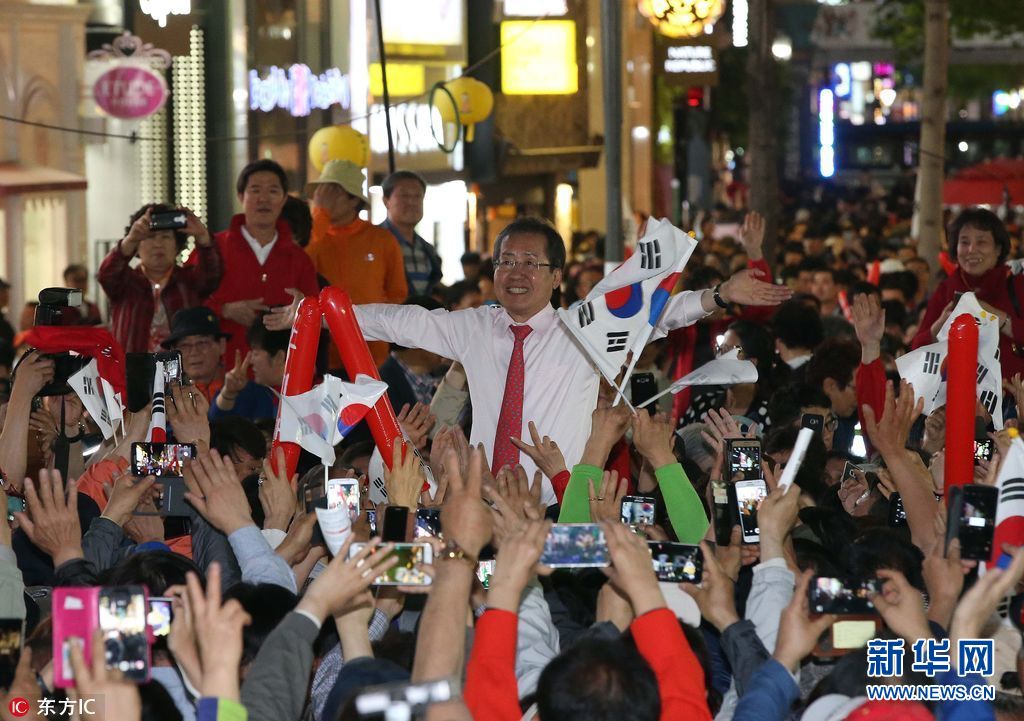 当地时间2017年5月3日,韩国大邱,自由韩国党总统候选人洪准杓洪准杓在大邱东城路举行竞选游说活动,并在活动上跪地向市民行大礼。(图片来源: 东方IC)
