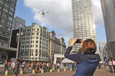 这是日前在巴西圣保罗市政厅前举行的中国产无人机试飞活动。为加强城市安保,增强警方处置紧急情况能力,圣保罗市政府正式引进中国产无人机,并将投入使用。