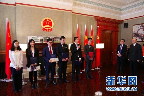 曼彻斯特获得2016年“国家优秀自费留学生奖学金”的获奖者代表发表获奖感言。 新华网记者 潘俊 摄