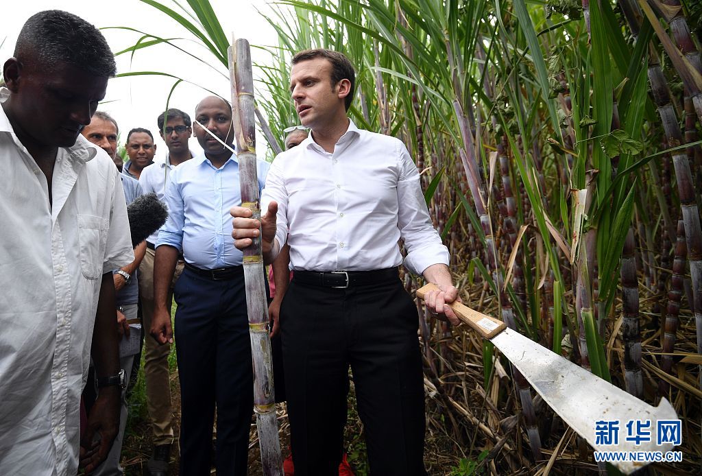 当地时间2017年3月25日,法属留尼汪,法国总统候选人马克龙在当地竞选时参观甘蔗种植园,执砍刀砍下一段甘蔗。