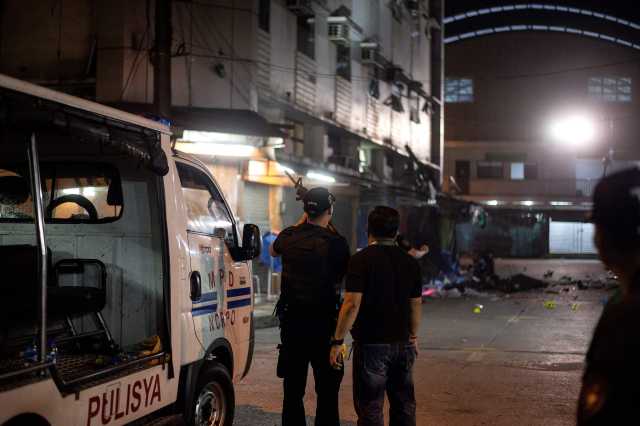 5月6日,在菲律宾首都马尼拉,警察在爆炸现场勘查。(新华社/法新)