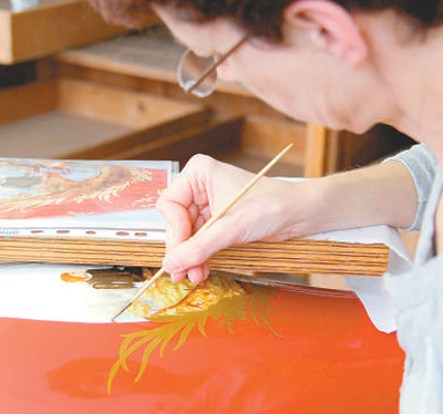 丹能贝格向记者展示她的各类绘图笔——从可以描绘动物毛丝的细笔到能够大块晕染的粗豪笔。丹能贝格的祖母、母亲都是瓷器画师,在迈森瓷器工作了一辈子。从小酷爱绘画的丹能贝格自然地从家人手中接过画笔,成为第三代画师,主攻釉上彩绘画。