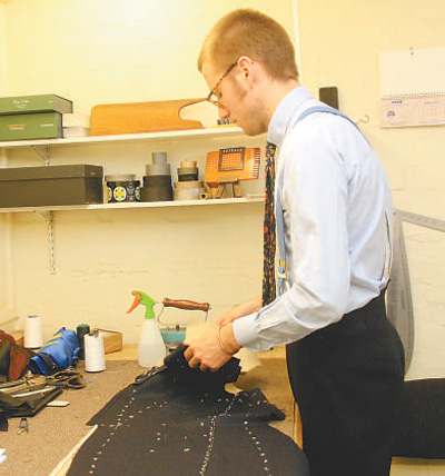 伦敦市萨维尔街的一家西装店里,裁缝在精心量裁衣服。 本报记者 黄培昭摄