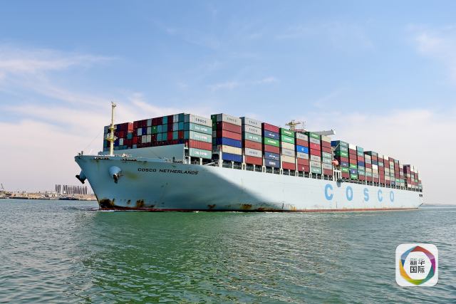 5月5日,中国远洋海运集团旗下的“中远荷兰”号通过埃及苏伊士运河。 (新华社记者赵丁喆摄)