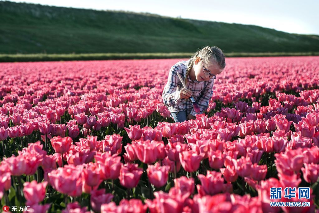 2017年5月9日报道(具体拍摄时间不详),荷兰漂亮的郁金香花田常常都让人感觉美得不真实,现在看来确实是这样。来看看这组照片,一位父亲记录下他的女儿为郁金香的着色的照片,令人赞叹不已。6岁的Lynn扛着巨大的颜料刷在为花田里的郁金香完成最后的着色。Lynn的父亲Jeffrey Bakker来自荷兰登海尔德,今年38岁,他说,他想拍点不一样的郁金香花田照,让它们变得有趣。(图片来源: 东方IC)