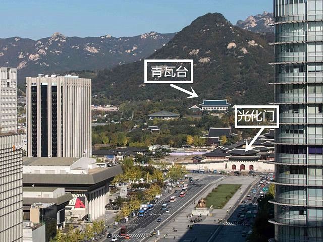 青瓦台总统府与光化门位置。(新华/法新)