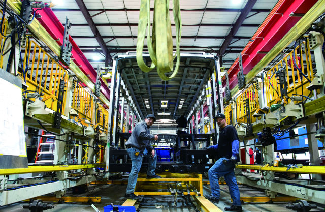 2017年3月23日,在美国兰开斯特的比亚迪北美工厂,工人在焊装车间工作