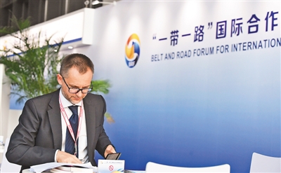 12日,一位参与报道的外国记者在“一带一路”国际合作高峰论坛新闻中心忙碌。