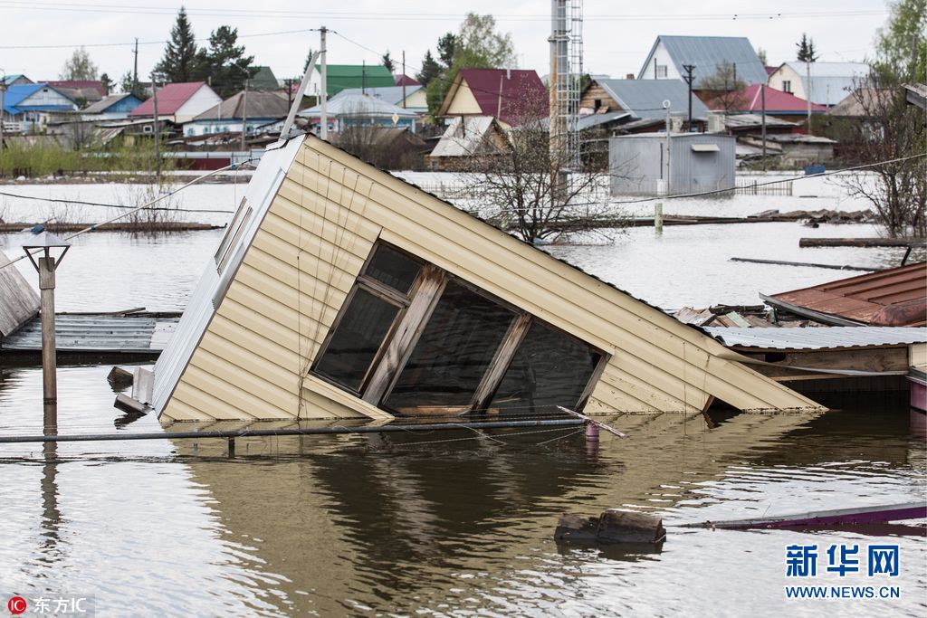 当地时间2017年5月12日,俄罗斯秋明,当地Ishim镇遭遇洪水袭击,房屋被淹浸泡水中。据俄罗斯紧急情况部秋明分部消息,该镇约5934间夏季用房和53户居民房被淹。(图片来源: 东方IC)
