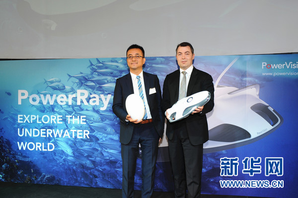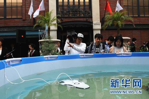 发布会场外举行了PowerRay的水中操作演示。新华网记者 华义 摄