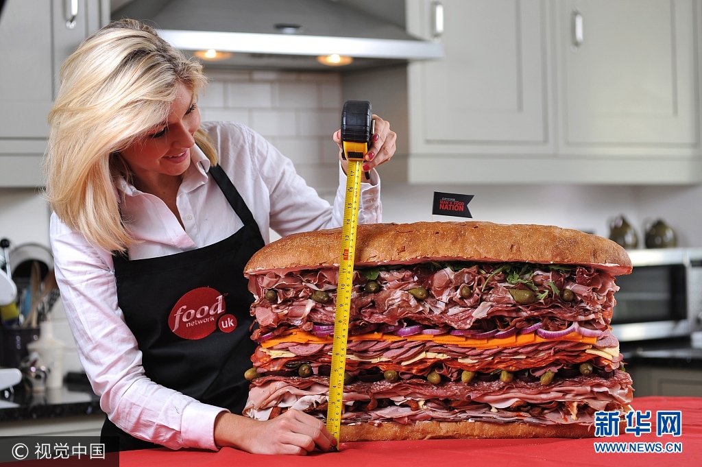 当地时间2012年5月22日,英国,为了庆祝英国美食频道一档名为“食物与人类”的节目开播,节目组精心打造了一只巨大的三明治。图为来自伦敦的Anna Watts 正在测量三明治大小。图片来源:视觉中国