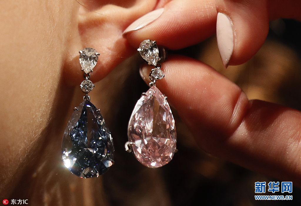 当地时间2017年4月10日,英国伦敦,苏富比拍卖行展出一只14.54克拉阿波罗蓝钻耳环和一只16克拉阿尔忒弥斯粉红钻耳环。这对天价耳环估价5到7千万美元,将于5月16日在日内瓦进行拍卖。(图片来源: 东方IC)