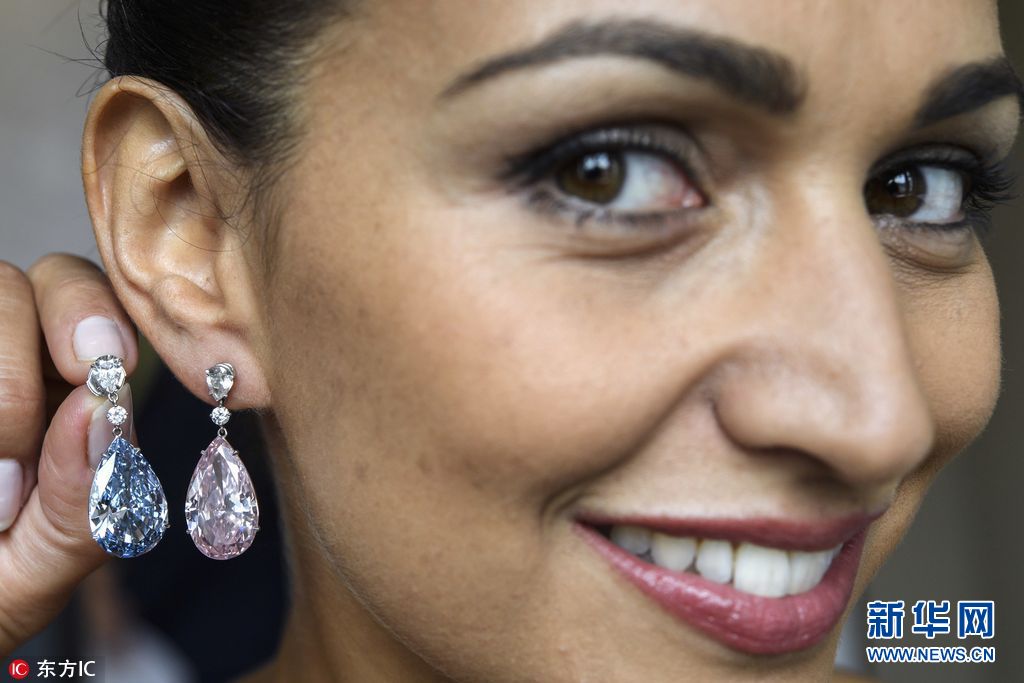2017年5月17日报道,苏富比拍卖行表示,在日内瓦16日举行的拍卖会上,14.54克拉阿波罗蓝钻耳环和16克拉阿尔忒弥斯粉红钻耳环,以创纪录的5740万美元(约合人民币3.95亿)天价成交。这对耳环是分开出售的,两枚耳坠由同一买家拍得。(图片来源: 东方IC)