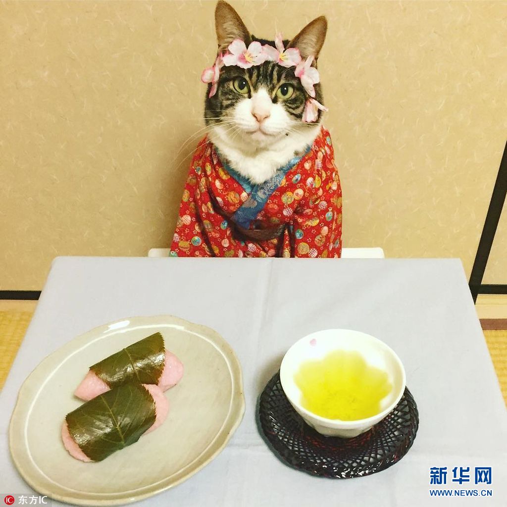 2017年5月17日报道(具体拍摄时间不详),来自日本3岁猫咪Maro配合主人Rie Matsui拍摄了一系列进餐时刻的照片。照片中Maro穿上各种服装,cos各种角色,淡定的坐在摆满美食的餐桌前。
