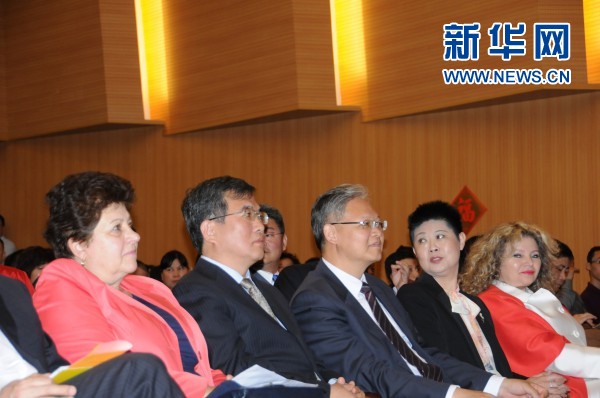 中国驻罗马尼亚大使徐飞洪(左三)和北京市人民政府侨务办公室主任刘春锋(左二)等在观看比赛。新华网记者 林惠芬 摄
