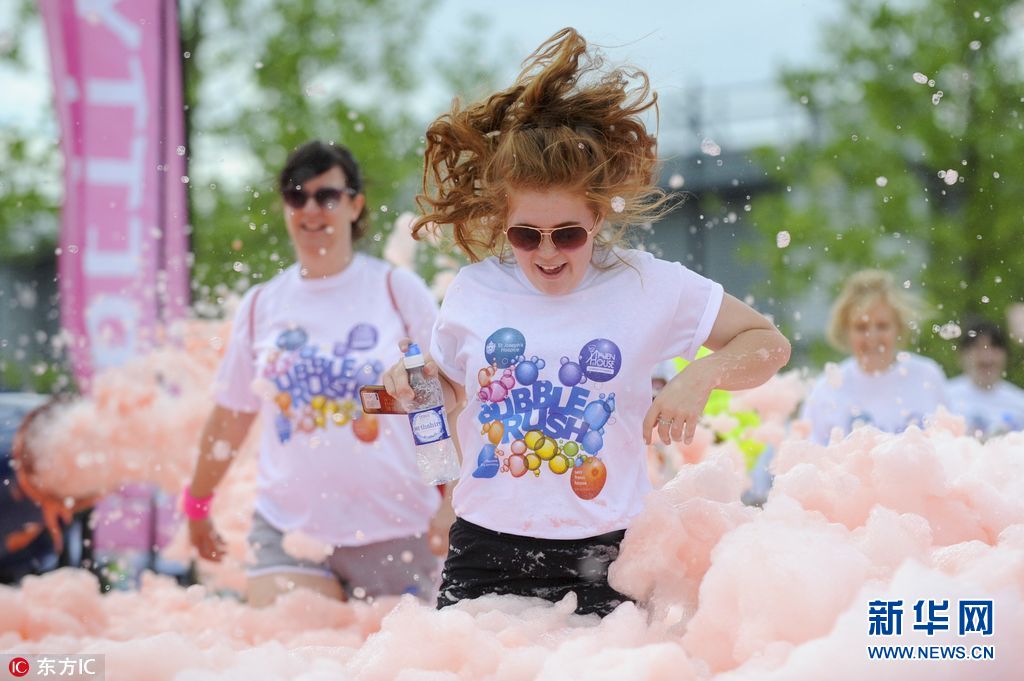 当地时间2017年5月21日,英国伦敦,一场“泡沫大战”正在位于东伦敦的奥林匹公园上演。参与者们在长达5公里的泡沫跑道上奔跑行走,场面十分热闹。这些粉色、黄色、绿色和蓝色的泡泡机是由当地慈善机构赞助的。(图片来源: 东方IC)