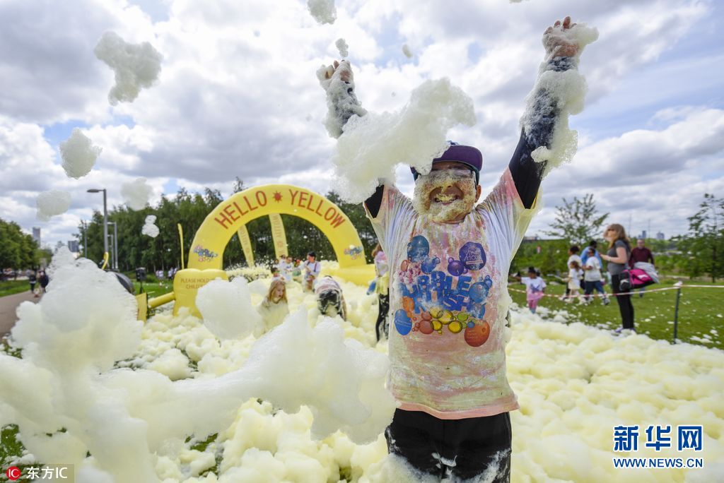 英国“泡沫大战” 梦幻上演 在彩色海洋来一场狂欢