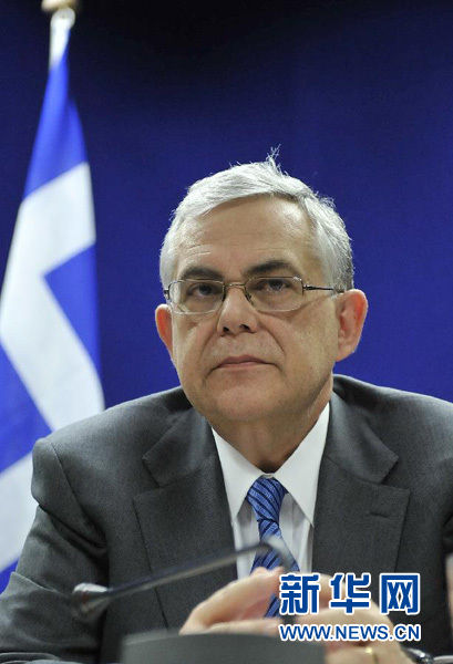 这是2012年2月21日在比利时首都布鲁塞尔的欧盟总部拍摄的出席欧元区财长会议后记者招待会的帕帕季莫斯(资料照片)。 新华社记者武巍摄