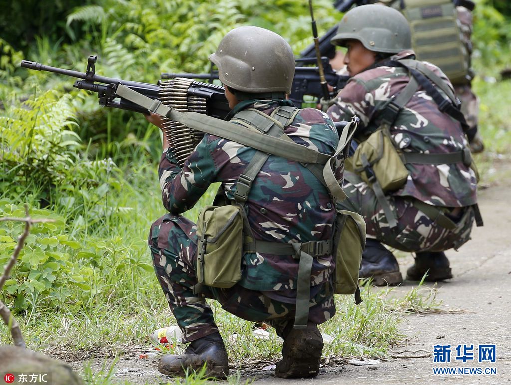 当地时间2017年5月30日,菲律宾马拉维,政府军士兵占据位置激战。据菲律宾武装部队发言人雷斯蒂图托·帕迪利亚称,截至29日晚,政府军与反政府武装在菲棉兰老岛马拉维市的激战已造成104人死亡。(图片来源: 东方IC)