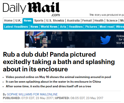 英国《每日邮报》网站5月23日发表了一篇文章,标题起得很长很长,翻译成中文就是《洗呀洗呀洗澡澡!熊猫被拍到在围栏里洗澡很开心,水花四溅》。从所附视频中可以看到,一只熊猫在水池里翻滚,好不快活。