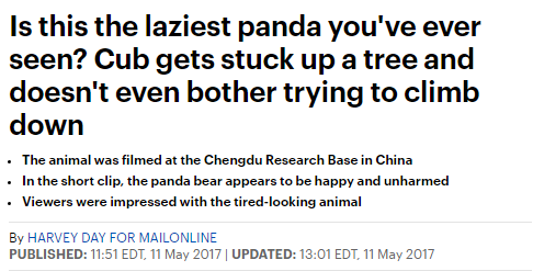 而5月11日发布的《这是你见过最懒的熊猫吗?熊猫崽卡在树上但好像并不想下来》一文则更是激发了国外网友的怜爱之心。文中还附有成都大熊猫繁育研究基地所拍摄的视频,视频中一只熊猫幼崽卡在一棵小树上,不时摇晃。