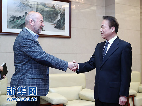 6月6日,新华社总编辑何平在北京会见今日俄罗斯电视台执行总编辑尼科洛夫。 新华社记者鞠鹏摄