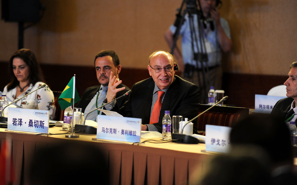 金砖国家媒体高端论坛开幕式6月8日在北京举行。图为论坛共同主席、巴西金融资讯集团总裁若泽·桑切斯发表讲话。 新华网 孙韬 摄