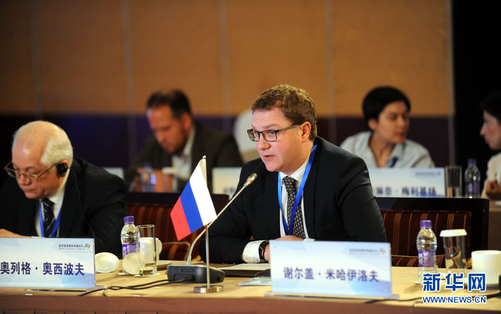 金砖国家媒体高端论坛开幕式6月8日在北京举行。图为论坛共同主席、俄罗斯卫星通讯社第一副总编辑奥列格·奥西波夫发表演讲。 新华网 孙韬 摄