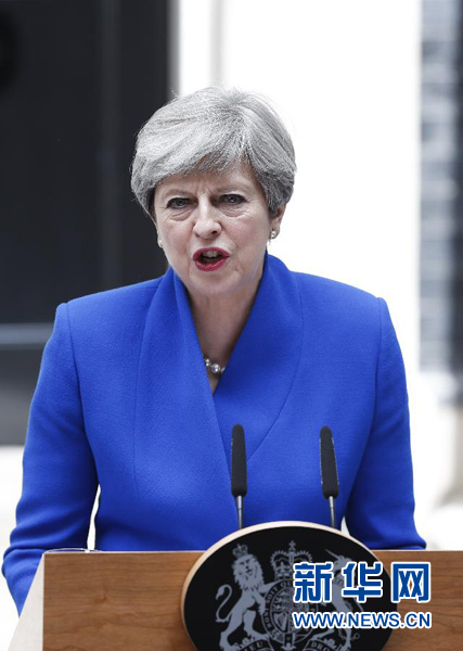 6月9日,在英国伦敦,英国首相特雷莎·梅在唐宁街10号首相府门前发表讲话。英国大选9日计票完成,结果显示,保守党未能在大选中赢得议会下院半数以上席位,不能单独组阁。首相特雷莎·梅当天在唐宁街宣布,将与民主统一党组建联合政府。新华社记者韩岩摄
