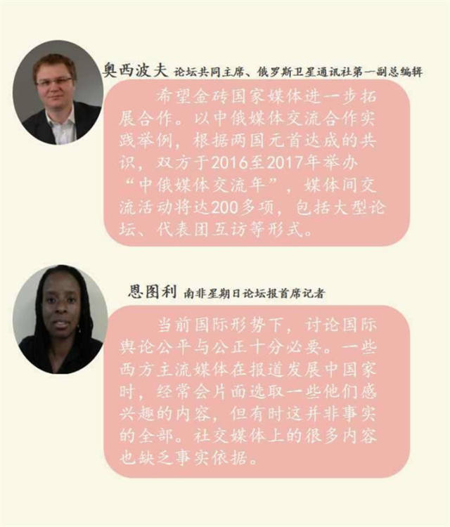 与会代表对提升金砖国家话语权有哪些构想?未来将如何开展合作?将如何顺应信息传播新形势?一起听听他们怎么说!