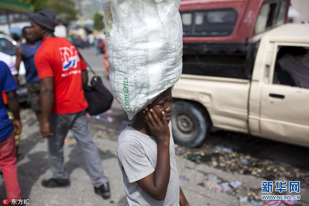 当地时间2017年5月23日,海地太子港,Watson Saint Fleur头顶着装满一袋袋小水袋的袋子在Petion-Ville的街上售卖。Watson今年12岁,但他没有上过一天学。他的日常被繁重的家务包围,同时,他每天都要顶着一袋子水在满是摩托车卡车的闹市街兜售。(图片来源: 东方IC)