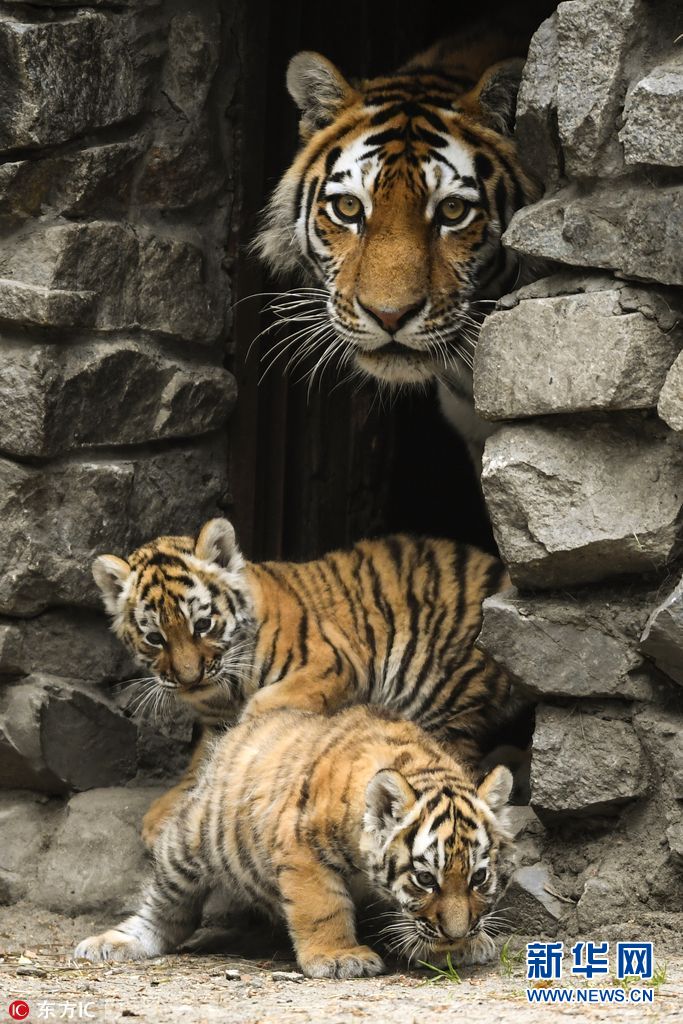 当地时间2017年6月10日,俄罗斯新西伯利亚,西伯利亚虎妈妈Lapa与它的幼崽在新西伯利亚动物园中玩耍。这对虎崽子是今年4月24日,Lapa与雄性西伯利亚虎Maximus诞下的。(图片署名: 东方IC)