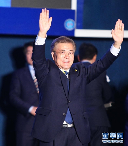 5月9日,文在寅在韩国首尔光化门广场向支持者致意。韩国中央选举管理委员会10日凌晨发布的数据显示,共同民主党候选人文在寅确认在韩国第19届总统选举中获胜,当选韩国总统。新华社记者姚琪琳摄
