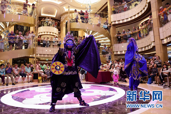 6月19日,川剧变脸演员蒋进(左)和搭档在“盛世公主号”邮轮上表演川剧变脸。搭乘国际邮轮在大海上航行,享受一段惬意时光,是许多西方人喜爱的度假和旅行方式。借“盛世公主号”海上丝路首航之机,以推动民间外交为己任的中国人民对外友好协会在船上开展“沿海上丝绸之路 讲中国故事”系列活动。四川代表团负责的是从槟城至泰国曼谷航段的活动,主题为“丝路·味”。新华社记者杨依军摄