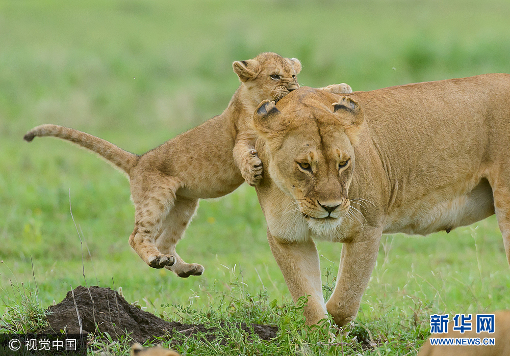 坦桑尼亚:调皮狮宝宝练习扑咬玩耍 狮子妈妈“不胜其烦”