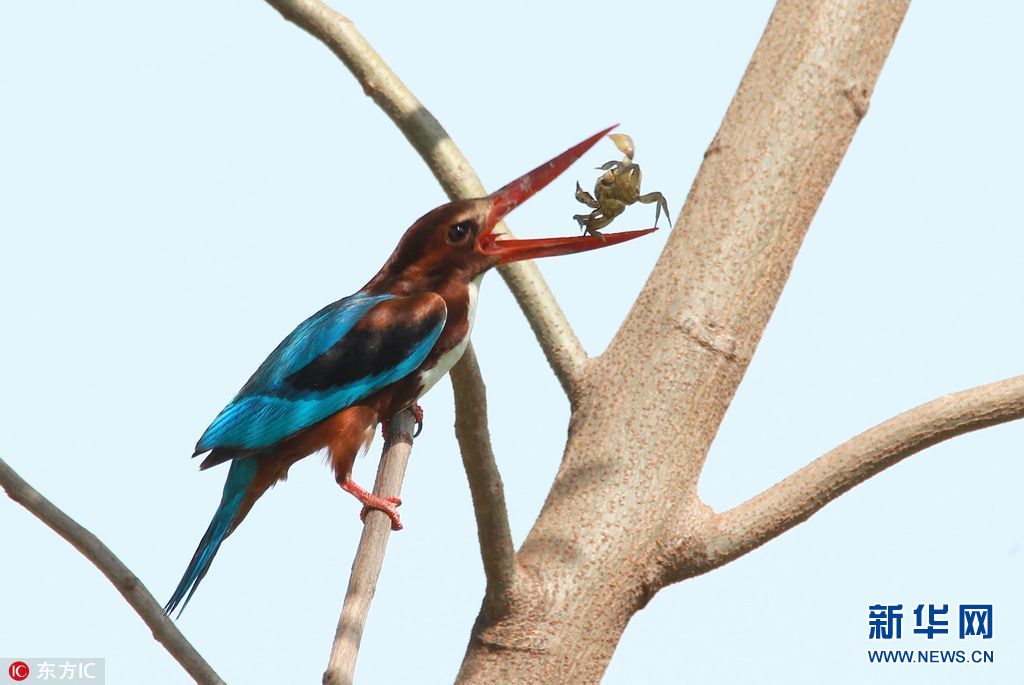 2017年6月20日报道(具体拍摄时间不详),画面中这只白胸翡翠正跟一只小螃蟹上演拉锯战。这只翠鸟站在树枝上,拼命想把小螃蟹塞进嘴里,但是小螃蟹负隅顽强,拼了命往外逃,可怜的翠鸟这顿饭吃得也是辛苦!(图片来源:东方IC)