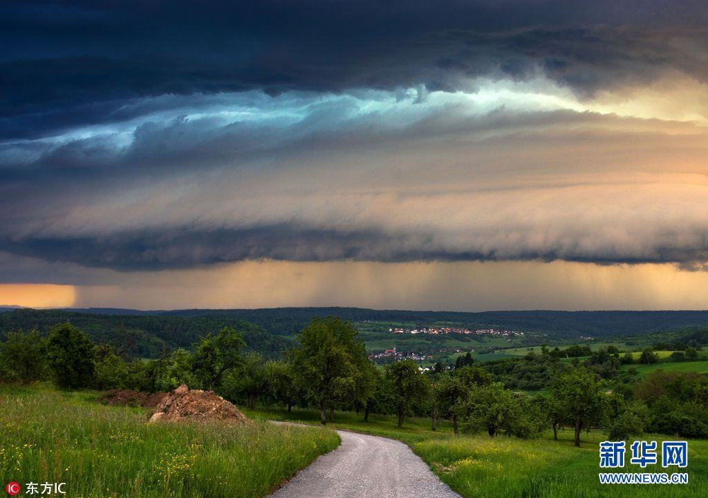 2017年6月27日报道(具体拍摄时间不详),一位风暴追逐者冒着风雹拍摄下这组最美丽的云层照片。27岁的摄影师Maximilian Ziegler来自德国路德维希堡,是一名气象与气候学专业的测量员。这位天气观察员在德国斯图加特附近拍摄下了这些照片,画面中一个超大胞的云层盘旋在起伏的群山之上,震撼之极。(图片来源: 东方IC)