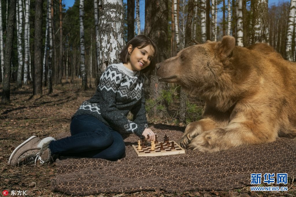 2017年6月27日报道(具体拍摄时间不详),这些令人惊异的照片显示一名女子竟然同一头巨熊在森林中友好嬉戏,时而下下棋,时而读读书、时而来几张自拍,看着分外和谐。