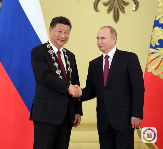 7月4日,国家主席习近平在莫斯科克里姆林宫同俄罗斯总统普京举行会谈。这是会谈后,普京向习近平授予俄罗斯国家最高勋章“圣安德烈”勋章。新华社记者 刘卫兵 摄