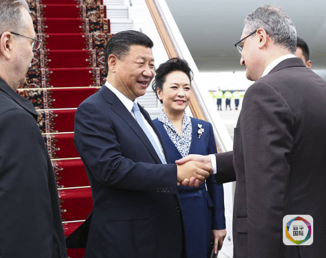 7月3日,国家主席习近平乘专机抵达莫斯科,开始对俄罗斯联邦进行国事访问。这是习近平和夫人彭丽媛受到俄罗斯政府高级官员热情迎接。(新华社记者谢环驰摄)
