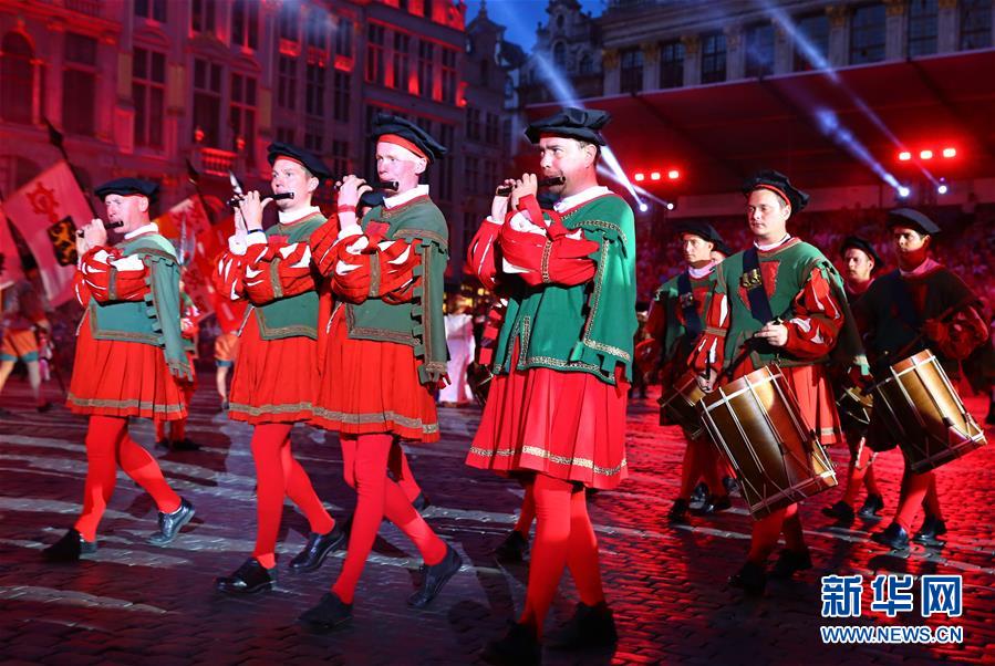 7月5日,在比利时首都布鲁塞尔大广场,演员在“大帝巡游”表演中演奏。一年一度的“大帝巡游”古装表演再现了16世纪神圣罗马帝国皇帝查理五世于1549年巡游至布鲁塞尔的场景。“大帝巡游”表演始于1930年,已有80多年的历史,目前已成为布鲁塞尔每年夏天极富盛名的民俗表演活动。新华社记者龚兵摄