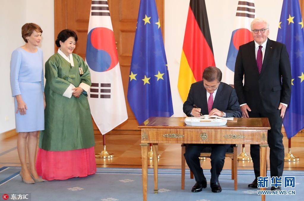 韩国总统文在寅出访德国 妻子着传统韩服亮相(组图)